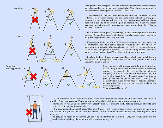- Safe For All Your Family Members: Unlike some other Pull Up Dip Stations with narrow footprint, KT Freestanding Pull Up Bar is much more widely so your shin or knee will never hit on the frame as you drop back down from pull ups. You will never feel cramped in it even if you’re a big person. The handle bar width is 39.37’’, allows you to hold wide or narrow as your fitness purpose. Its handle bar also NEVER falls down suddenly like some kinds of doorway pull up bars