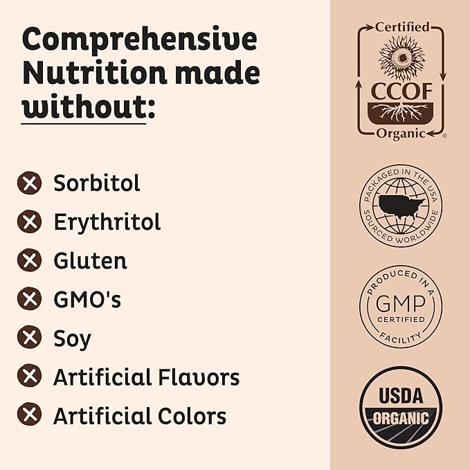 - Responsibly Sourced: Nearly every ingredient is certified organic and free of gluten, dairy, soy, hormones, artificial sweeteners, colors, and GMOs. Made with USDA and CCOF certified ingredients.