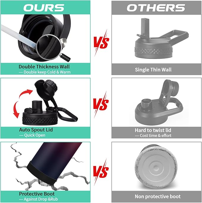 - 2 LID OPTIONS (Auto-spout & Straw): two different lids are complete LEAK PROOF & design for easy drink. The pops-up lid for easy drinking and seals shut for no leaks when you're on the go. The straw lid makes it easy to enjoy spill-proof sips, and package come with a alternative straw & a straw brush for easy cleaning