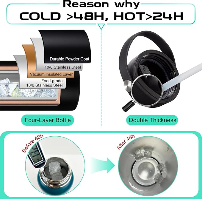 - TRIPLE-INSULATION & HIGH-PERFORMANCE: This wide mouth 1 gallon water bottle features triple-wall vacuum insulation and pro-grade stainless steel, it keep-cold for 48 hrs and keep-warm for 24 hrs without altering the taste and keeps your water tasting fresh. Using this metal water bottle on hot summer days or your next camping trip to stay hydrated all the day