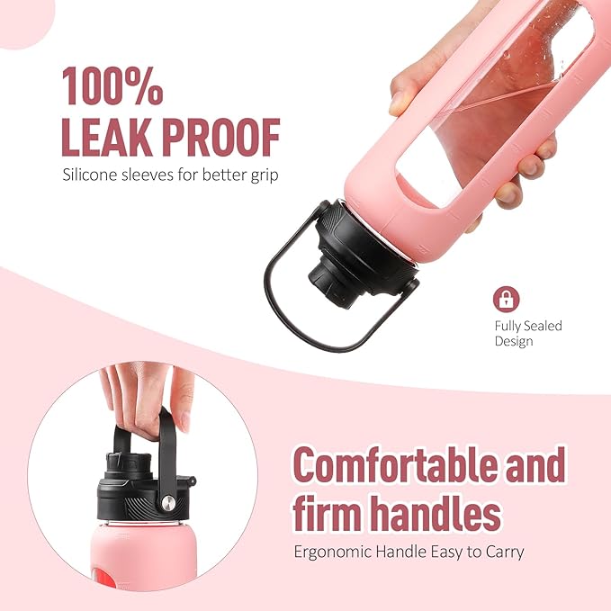 - BOROSILICATE GLASS EASY TO CLEAN- Our reusable water bottle is made of premuim borosilicate glass which is durable and thermal resistance. It can withstand high and low temperatures without shattering or cracking, which makes the glass waterbottle suitable for both hot and cold drinks. All parts are food grade, BPA free and lead-free. The wide mouth design allows for effortless cleaning and refilling, while the materials used are dishwasher-safe, providing added convenience for busy lifestyles.