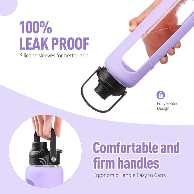 - WHAT YOU'LL GET - Our daily water intake bottle set comes with a water bottle covered with a silicone protective sleeve, 1 bamboo lid plus 1 spout lid with handle, 2 straws(1 stainless steel and 1 tritan), and 1 straw cleaning brush. You can switch between the two lids according to the occasion and preferences. If there is any problem with your water bottle glass or the lid is damaged within 6 months, you can contact us at any time for a replacement.