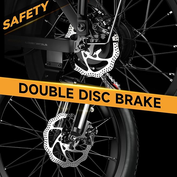 - 𝐒𝐚𝐟𝐞 𝐀𝐧𝐝 𝐂𝐨𝐦𝐟𝐨𝐫𝐭𝐚𝐛𝐥𝐞 𝐑𝐢𝐝𝐢𝐧𝐠: The electric bicycle adopts EABS power-off brake + front and rear double disc brakes for sensitive braking. It is designed with strong off-road performance, reliable braking force and high safety factor. High-strength shock-absorbing front fork and seatpost absorb the bumps of long, rough roads. The 20" fat tires are anti-slip and puncture-proof, ensuring you can ride like roads, snow, beaches, and rugged mountain roads.