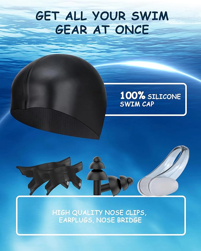 - VALUE KIDS SWIM GOGGLES SET - Get everything you need for swimming in just one choice: Swim goggles + Swim cap + Nose clip + Earplugs + Goggles case. With all this swim equipment together, kids can enjoy swimming in comfort and safety. Note: All accessories are stored in the goggle case.