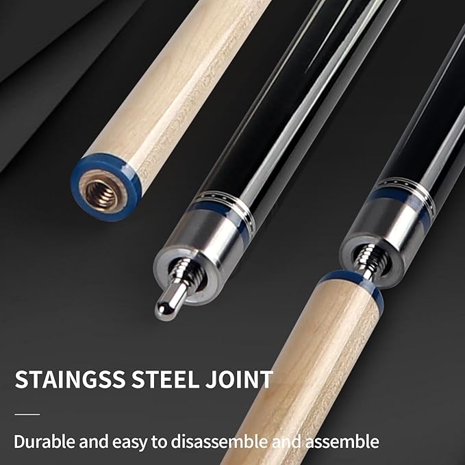 • Professional Pool Cue: Kmise 58-inch 2-piece detachable pool cue, weight 21OZ, made of high-quality Canadian hard rock maple, stainless steel joints, sturdy and durable and not easy to deform