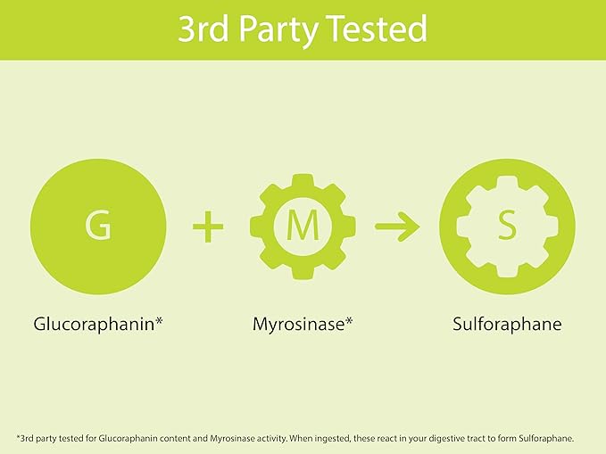 • GLUCORAPHANIN (Sulforaphane Glucosinolate) - 3rd Party tested for Glucoraphanin content. Myrosinase converts Glucoraphanin into Sulforaphane in the digestive tract.