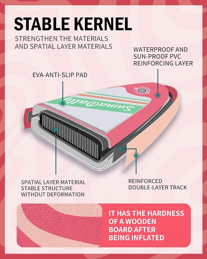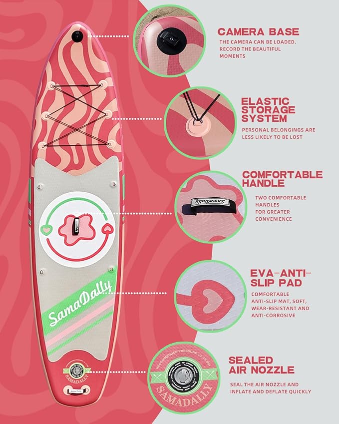 - Spacious & Enjoyable: SamaDally Candy Star series inflatable stand-up paddle boards are 1 to 2 inches wider than other similar products. 34in paddle surface is extremely spacious. Both beginners and paddleboards enthusiasts can find their own water - based fun on this SUP and enjoy a relaxing time.