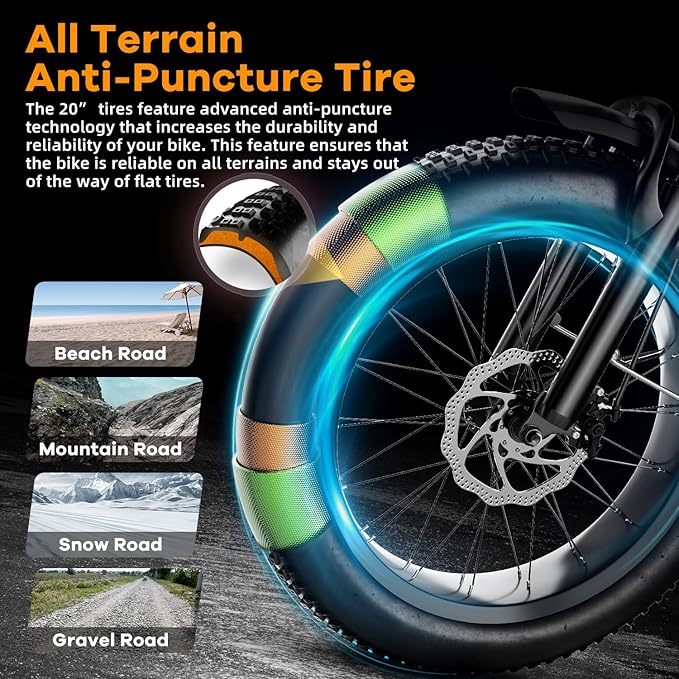 - 𝐒𝐚𝐟𝐞 𝐀𝐧𝐝 𝐂𝐨𝐦𝐟𝐨𝐫𝐭𝐚𝐛𝐥𝐞 𝐑𝐢𝐝𝐢𝐧𝐠: The electric bicycle adopts EABS power-off brake + front and rear double disc brakes for sensitive braking. It is designed with strong off-road performance, reliable braking force and high safety factor. High-strength shock-absorbing front fork and seatpost absorb the bumps of long, rough roads. The 20" fat tires are anti-slip and puncture-proof, ensuring you can ride like roads, snow, beaches, and rugged mountain roads.